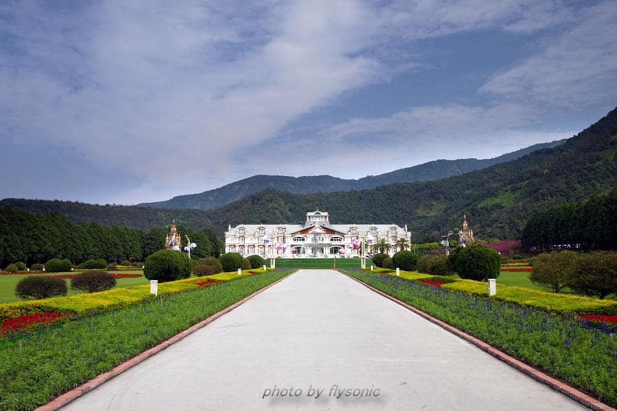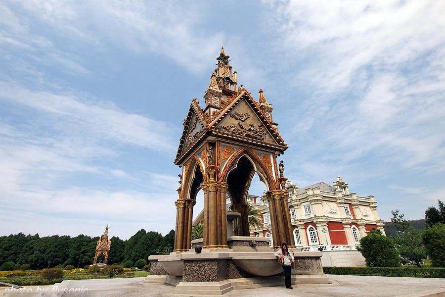 ↙由於到九族時,已經快要中午12點,小寶貝肚子已經有點餓,問她要不要看櫻花,結果她不要,她要吃飯飯。一聽她這樣講,就只好先帶她到水沙連歐洲宮廷花園去用餐。這宮廷花園整理的蠻漂亮,現場有許多人在這裡拍婚紗!