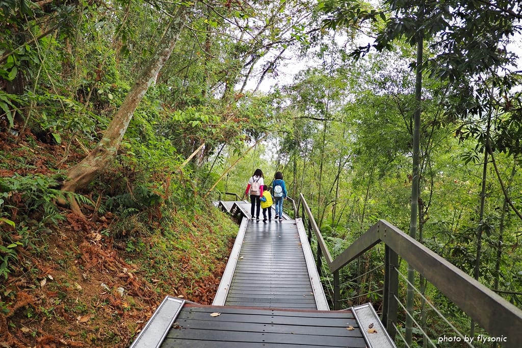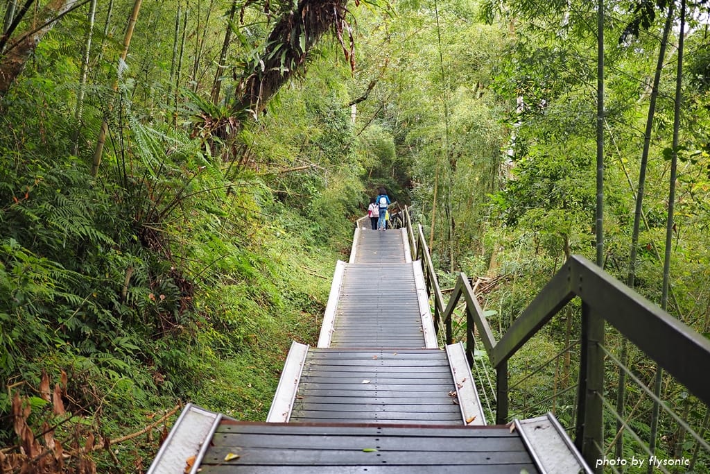 經過一連串的階梯之後,步道趨於平坦,兩旁是竹林、蕨類的原生樹林。