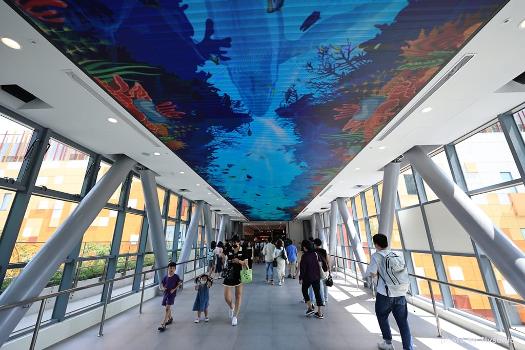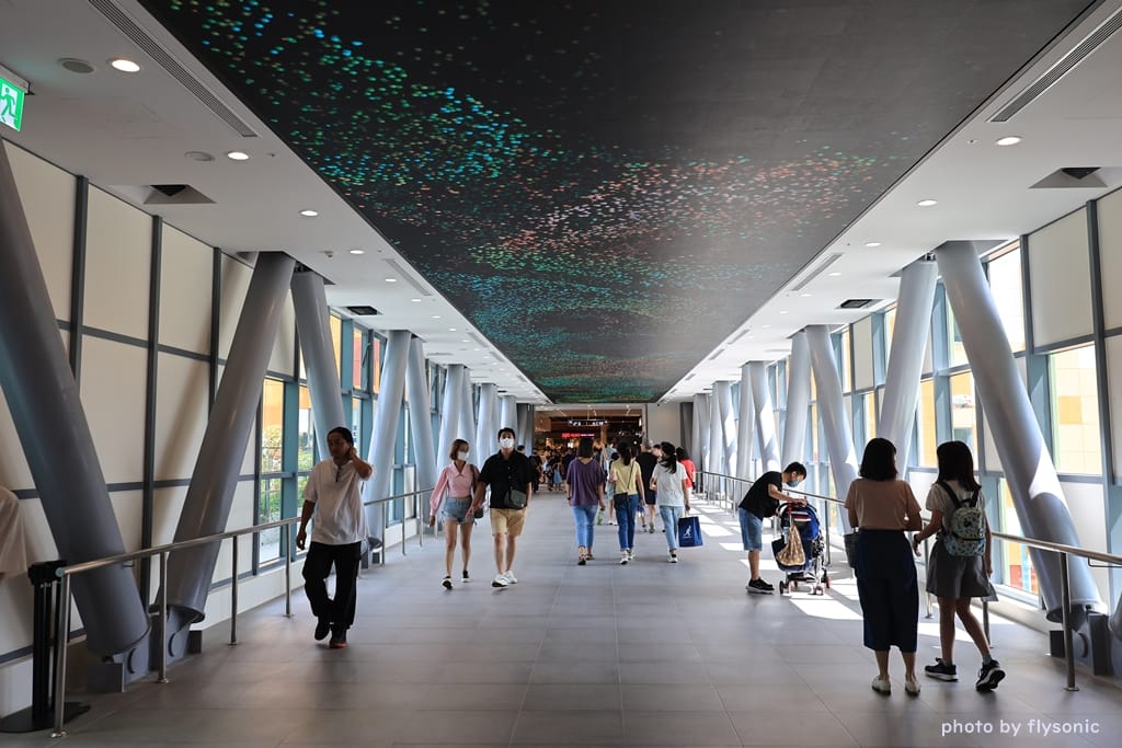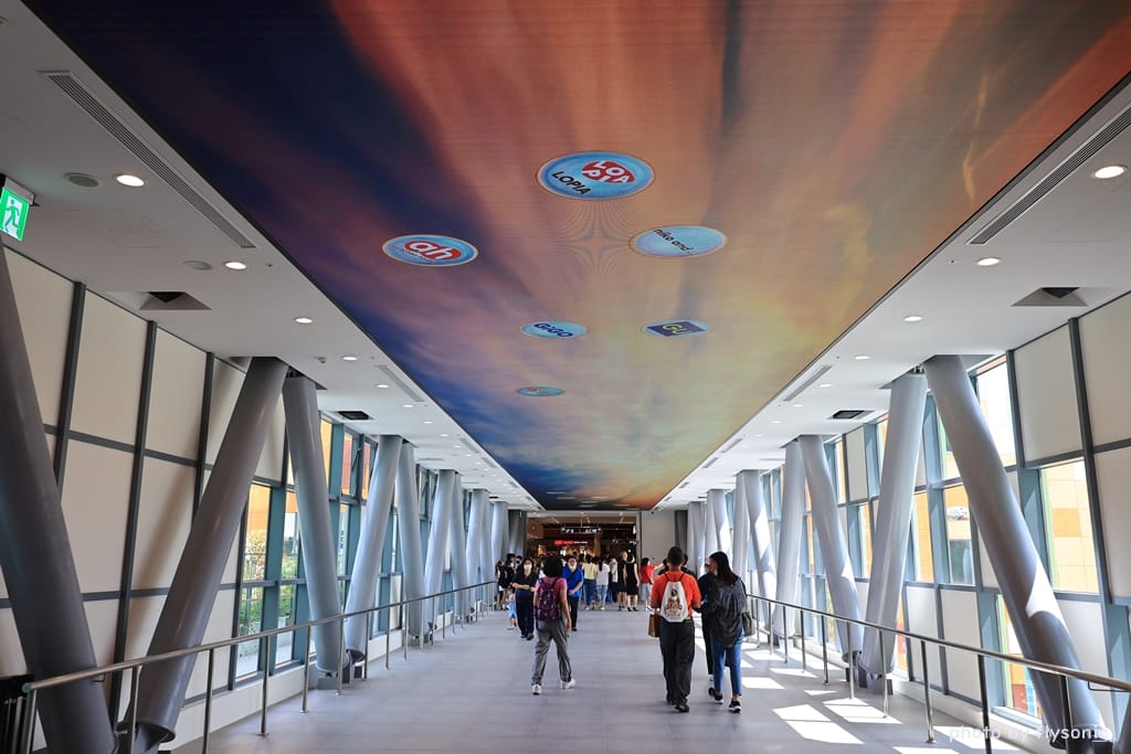這座空橋是室內的,上方有個動態螢幕,會撥放著各種影像,呈現出不同的氣氛。