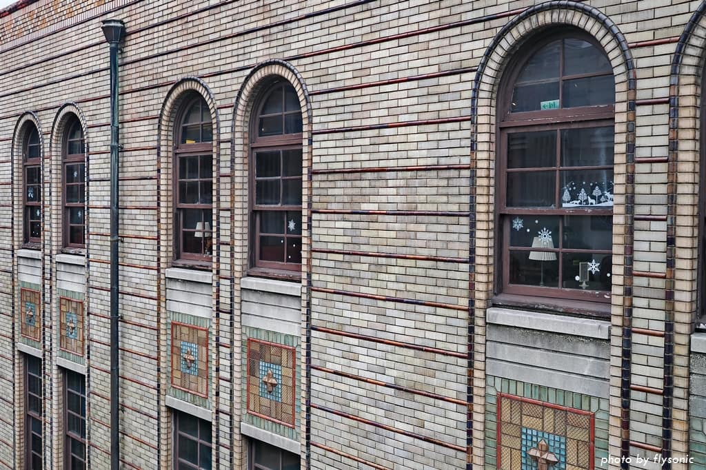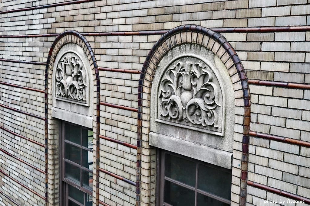 近看中山堂美麗的磁磚、石雕,與復古的木造格窗。