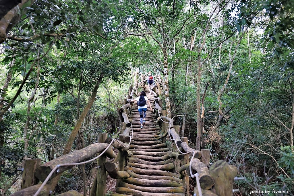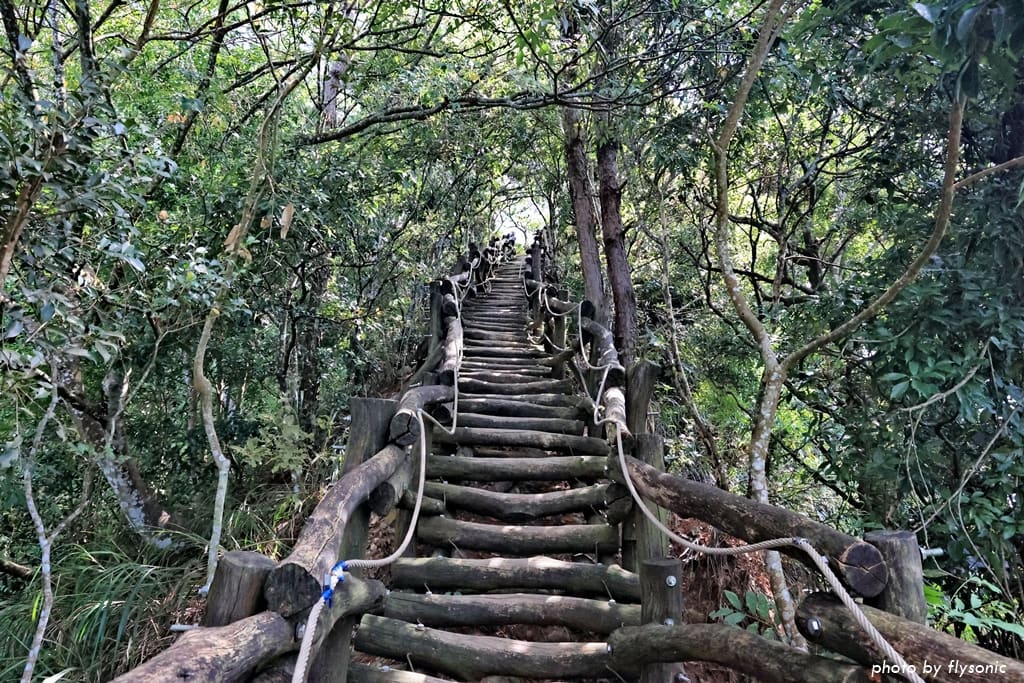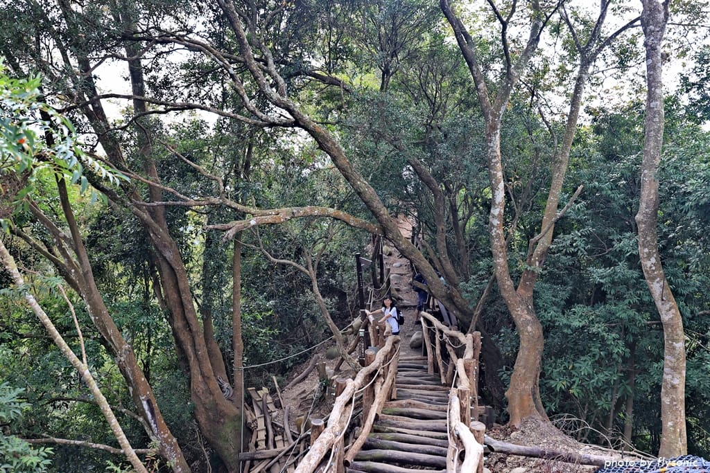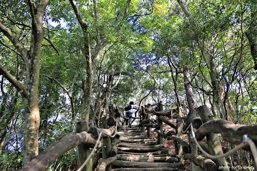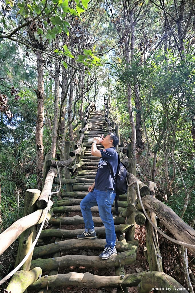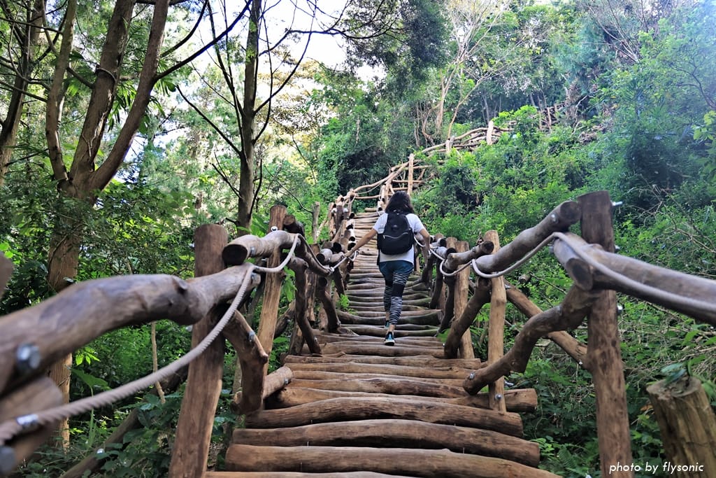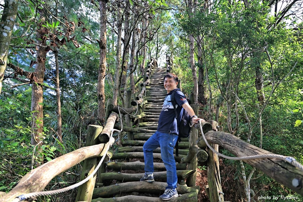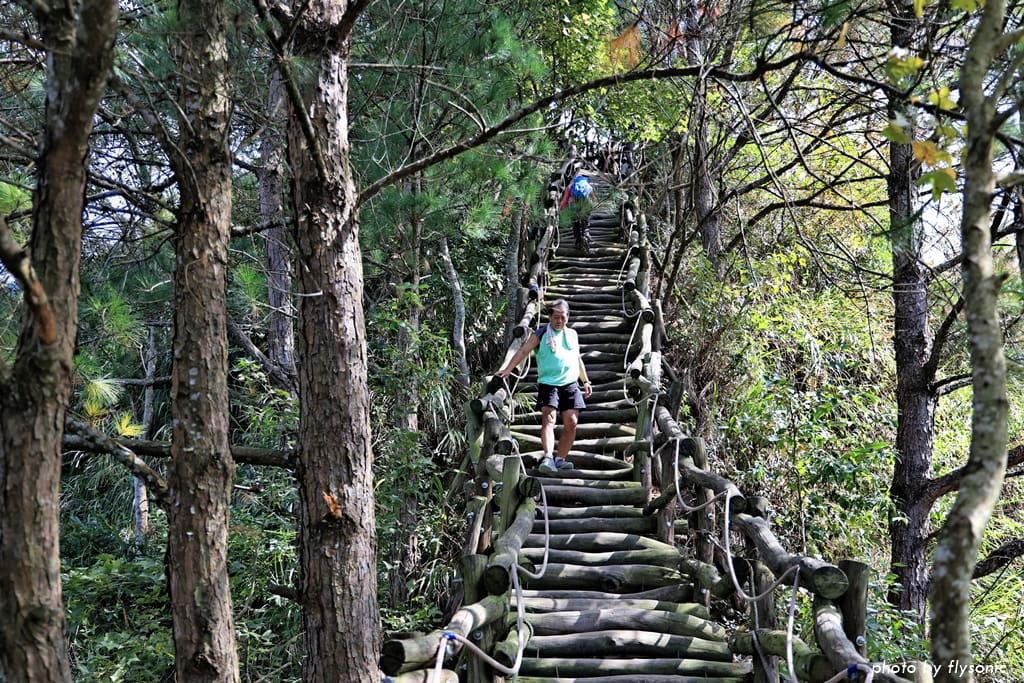 這連續陡坡真不是蓋的,不停往上爬,如果是一般樓梯還好,走這種圓木步道真是累。