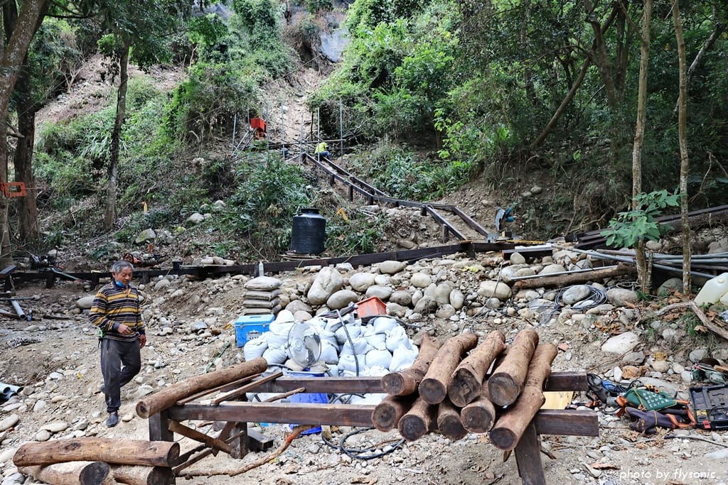 路旁有工人正在架設步道,他們扛著一根一根的圓木,鋪在架好的軌道上,原來圓木步道就是這樣鋪出來的,真的很辛勞。