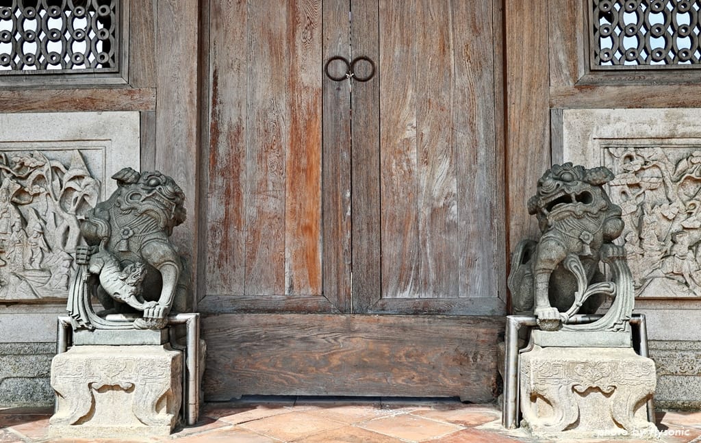 大門兩側有一對青斗石獅,後方的木造窗花,線條簡約耐看。