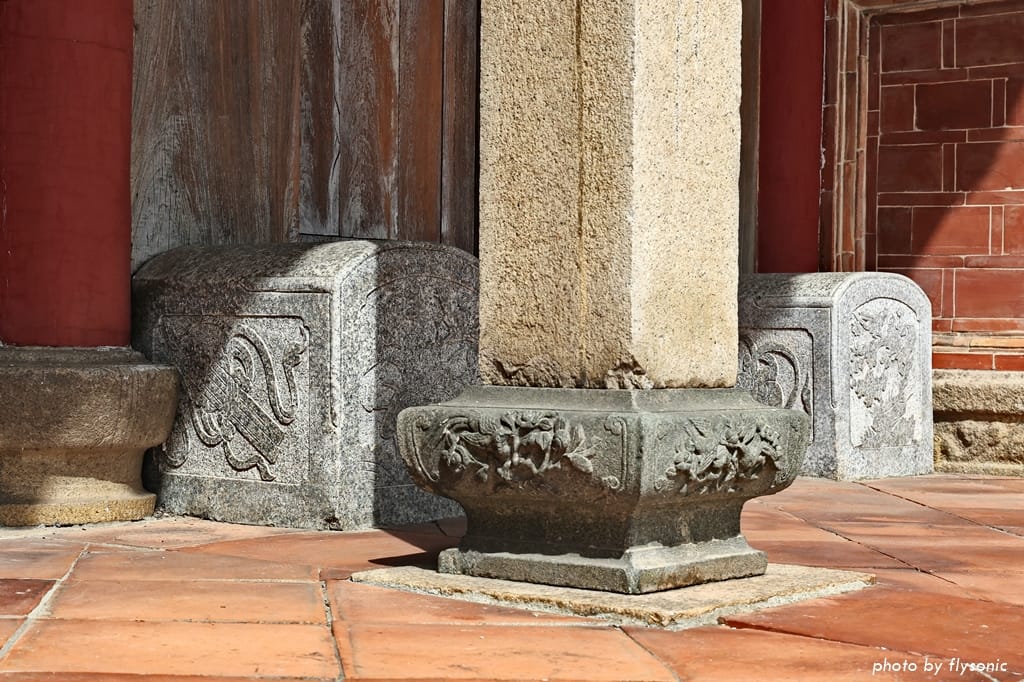 大門四個石鼓上刻有吉祥花鳥圖案以及琴、棋、書、畫,藉此勉勵學子應才學兼備。