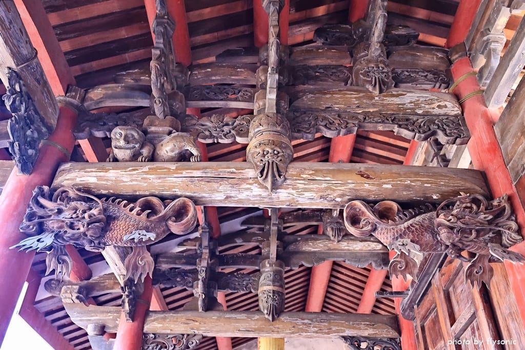 抬頭一看,三川殿門廊下的斗拱、吊筒和瓜通,雕刻得好華麗!通樑下的四個雀替,全是木刻蛟龍,用以祈求避免發生火災。