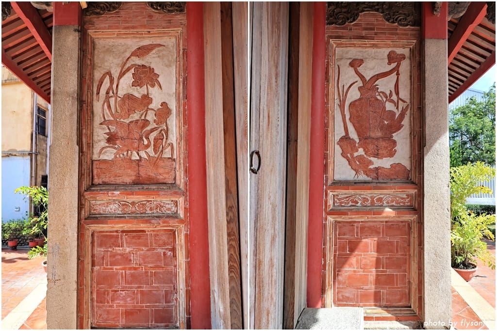 磺溪書院的龍虎堵跟一般廟宇的不太一樣,一般廟宇是左青龍右白虎的雕塑,磺溪書院的則是花鳥圖案,而且是用質樸的雕磚,非常少見。