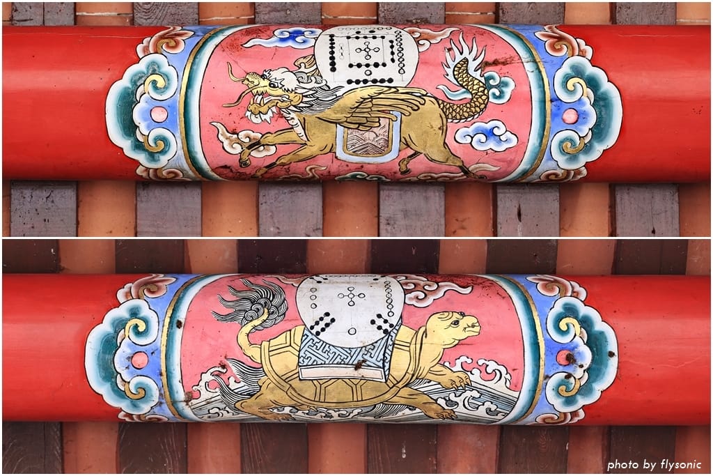 上古傳說的河圖、洛書不只是中國文明的起源,也是數學、哲學之本,在寺廟彩繪、木雕或是石雕都可以看到。不過這還我第一次注意到這種彩繪。