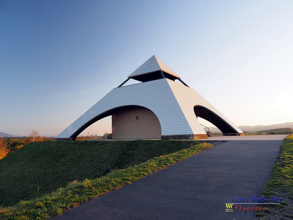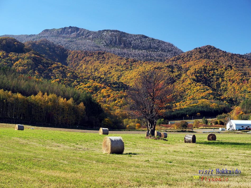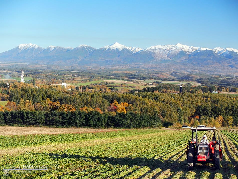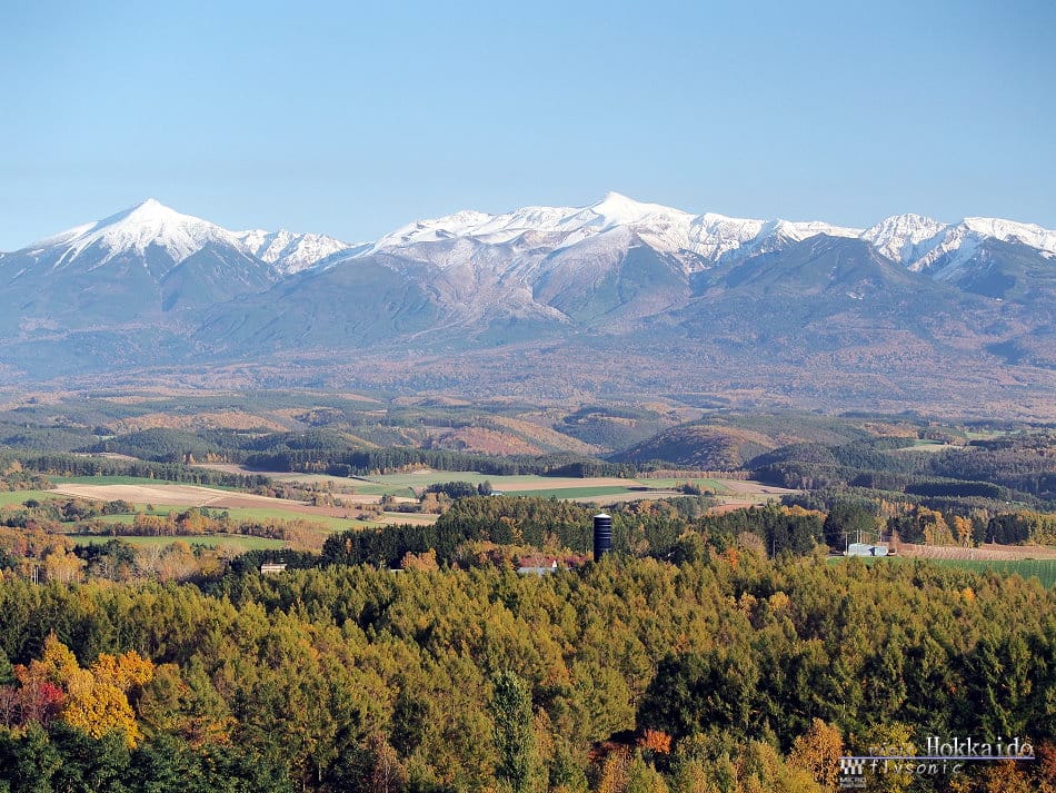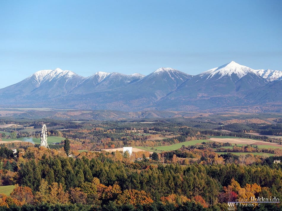 ↓ 已經黃昏了,太陽快要下山,就在這一刻,登上觀景台,看到一幅由紅葉、美瑛町、美瑛丘陵、十勝山連峰漸層構成的美景。