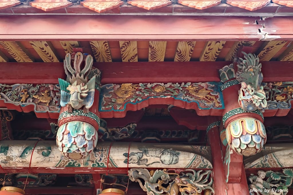 彩繪的龍柱是為了延續使用年限,因為梧棲靠海,海風很大。木雕的螭虎團爐窗,意寓香火不斷,子孫綿延。