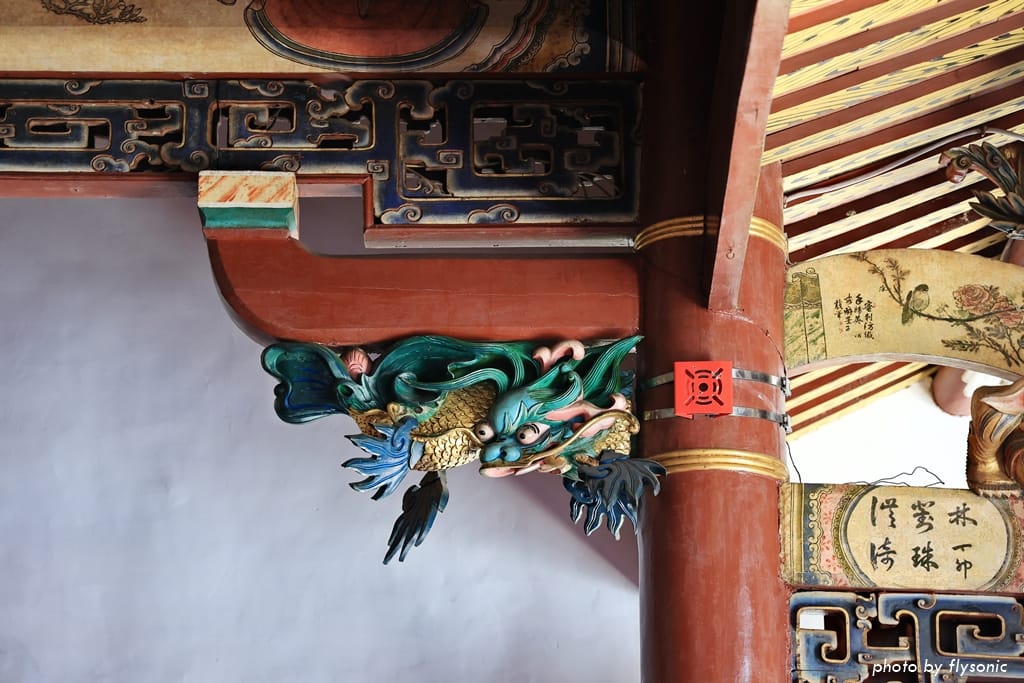 大木結構為三通五瓜抬樑式漳州風格,樑柱交接的雀替很精緻。