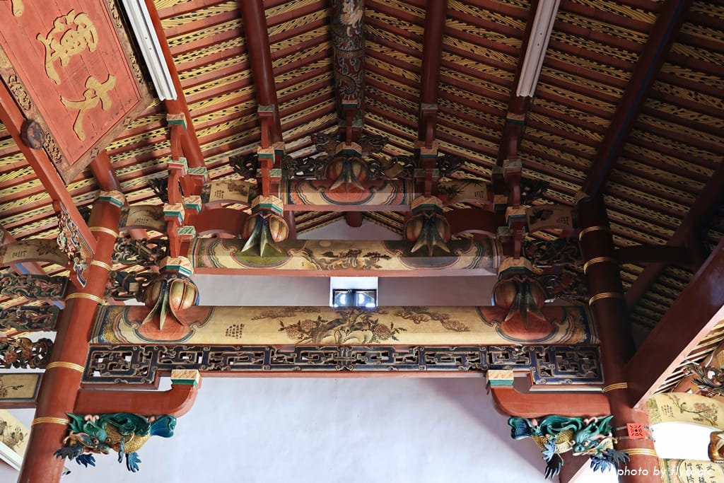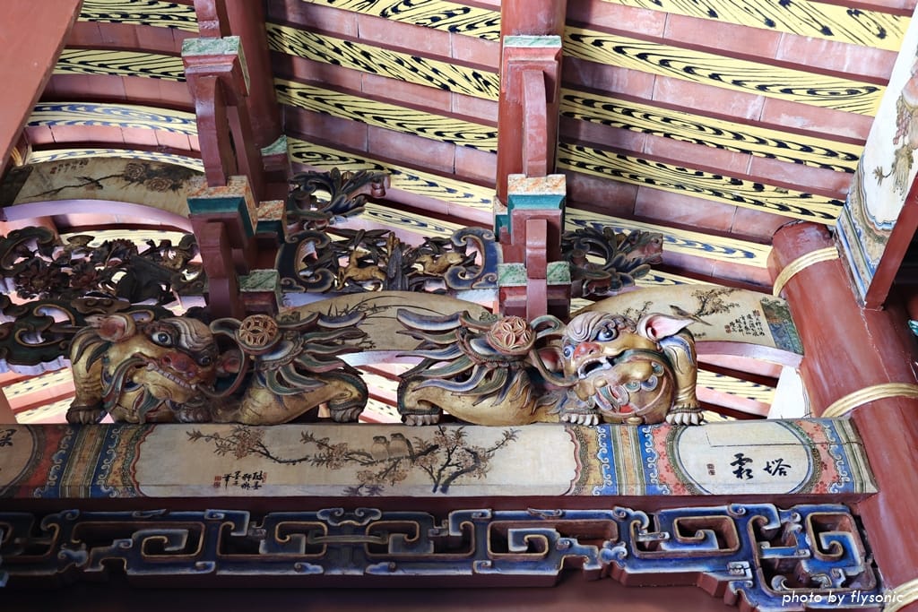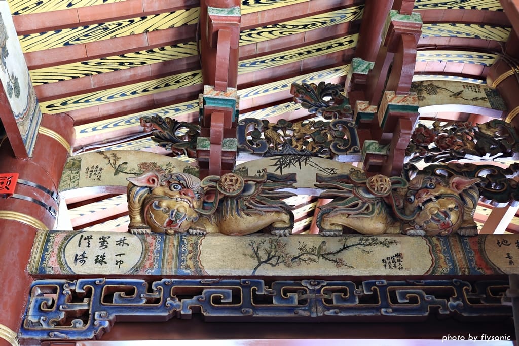 獅座裝飾及樑上的彩繪古樸美麗。