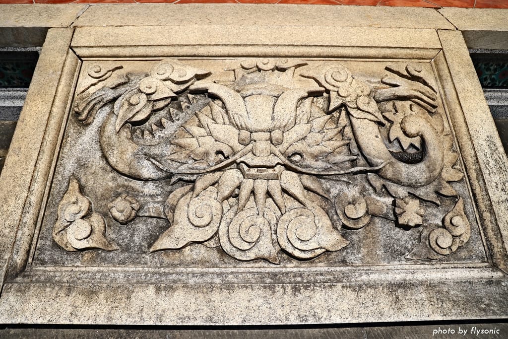 書院的正門、門柱皆有題聯,屋頂是燕尾翹脊、雙龍護塔。御路石旁邊的閩南花紋磚、藍白色的柱子,別具特色。