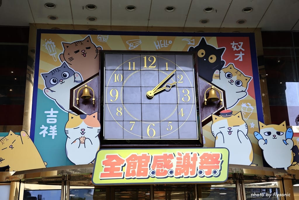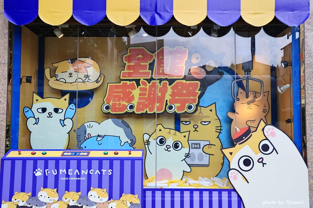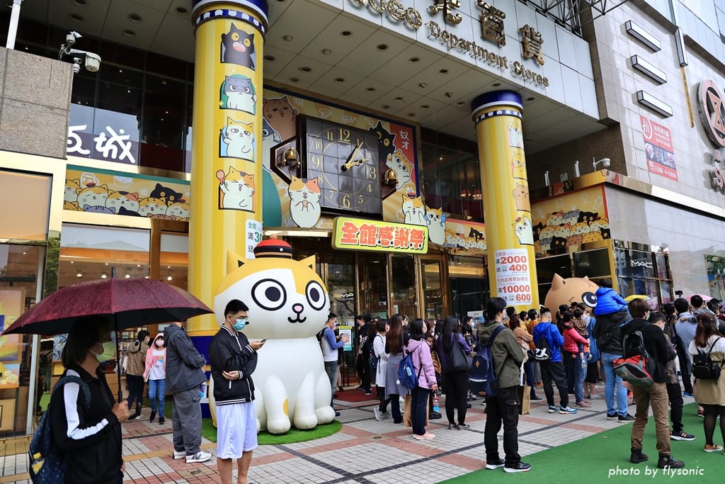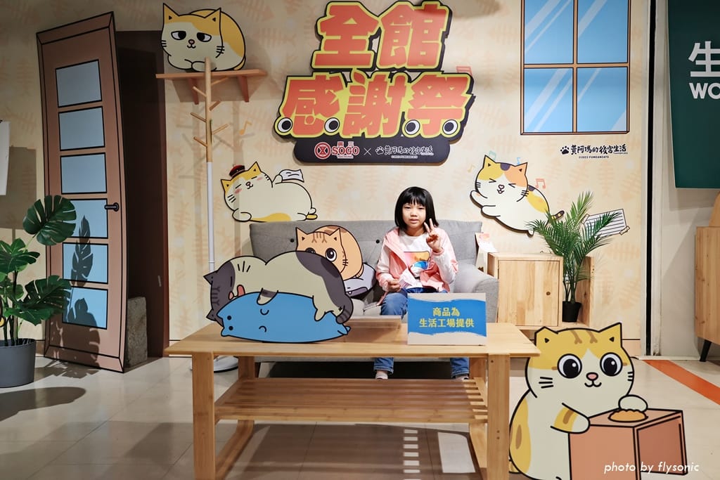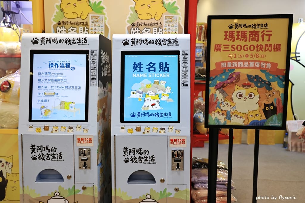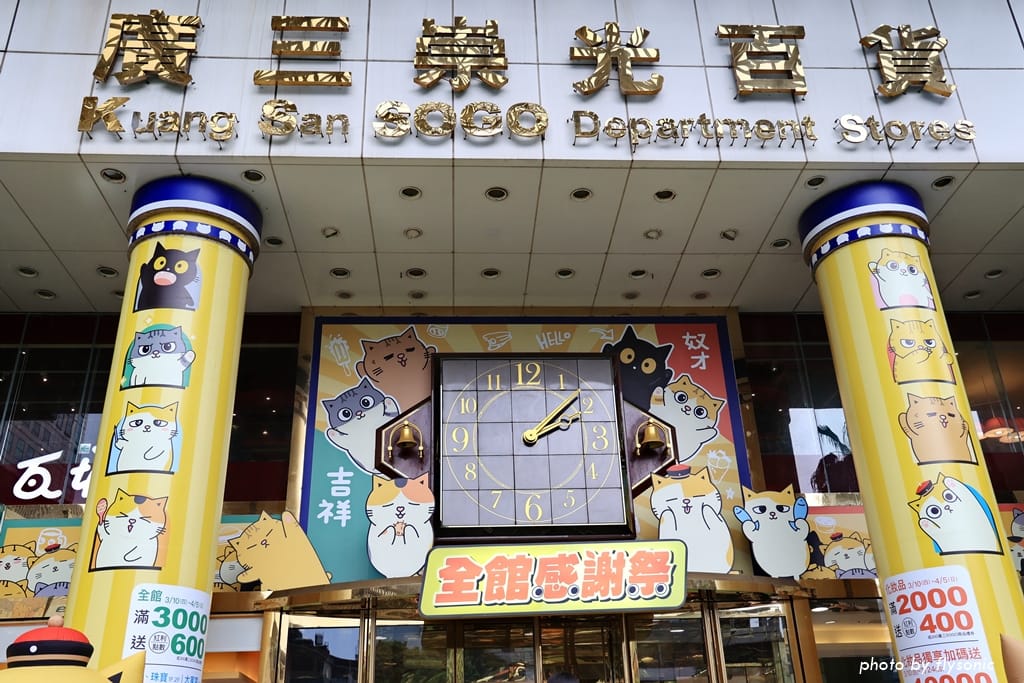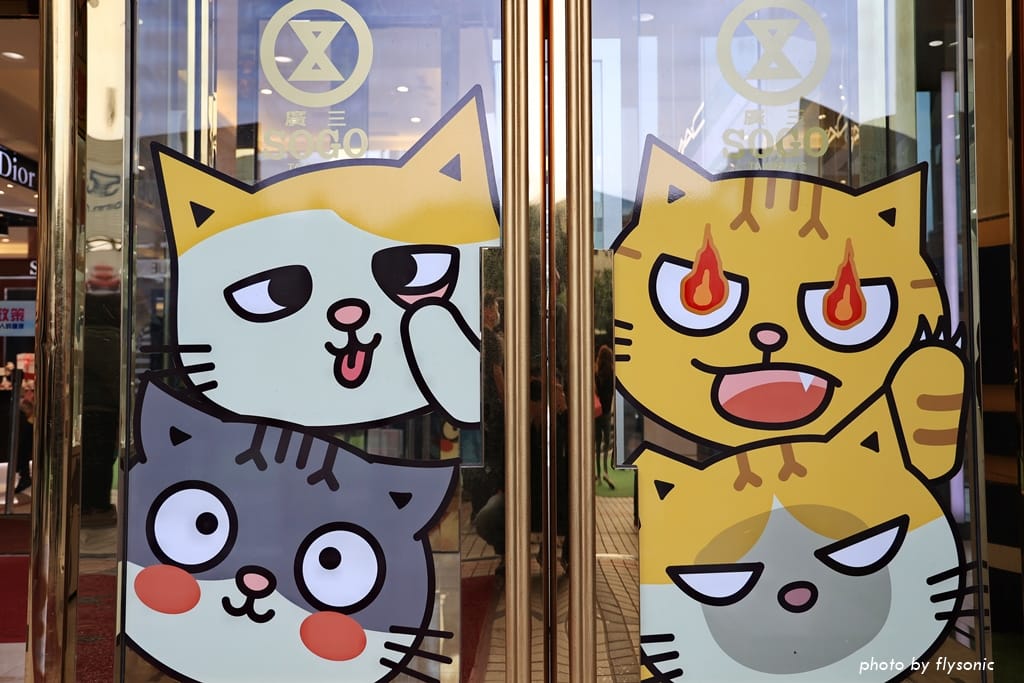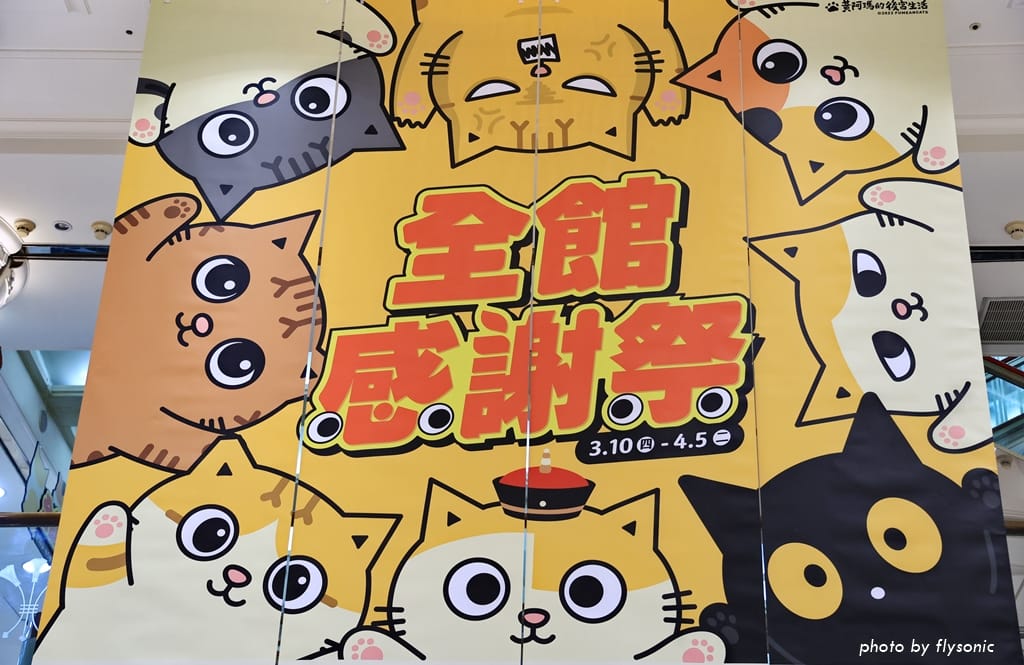 超人氣的「黃阿瑪的後宮生活」與台中廣三 SOGO 聯名推出感謝祭活動,大門口佈置了許多黃阿瑪跟他的貓咪,4/1 到 5/8 還有瑪瑪商行的快閃櫃。