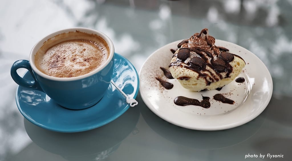點一杯漫森拿鐵咖啡($110)跟蒸蛋糕($55)。