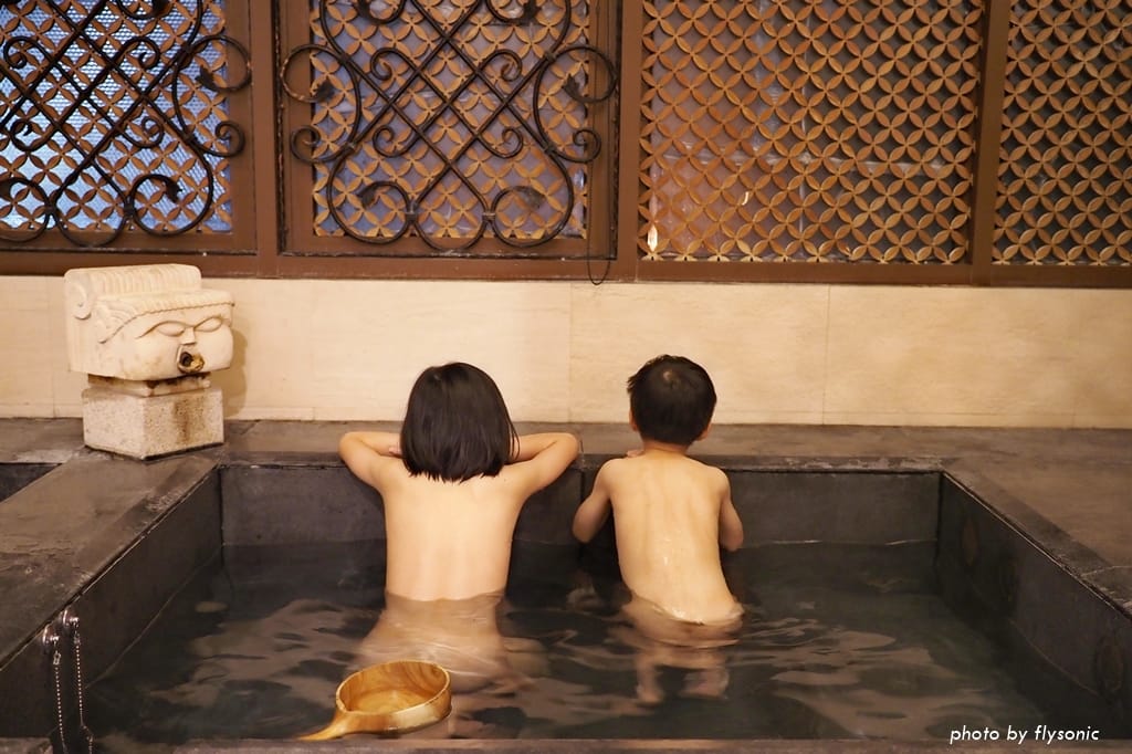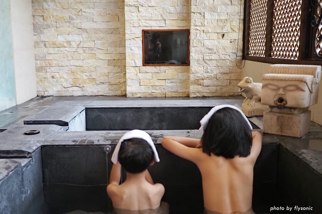 房間內的泡湯池非常大,我們一家四口下去泡,空間綽綽有餘,出水口也特別設計過,還配有電視,可以邊泡邊看節目。