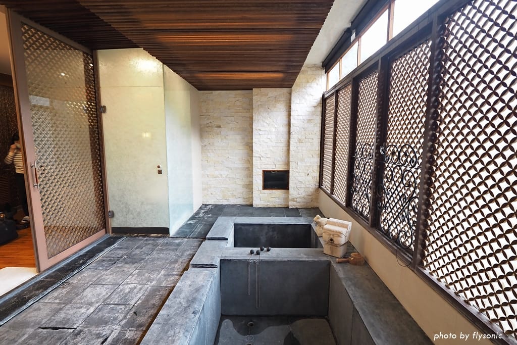 缺點是房間內的湯池不是露天或半露天,有對外窗但只能打開一部分,泡湯時是看不到景色的;空調高於 25 度太熱,低於 25 度就會太冷,不是很好睡,需要檢修一下;馬桶設計在湯池旁邊,上廁所會踩到濕濕的地板,要小心不要滑倒。
