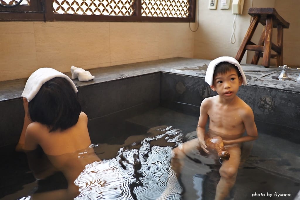 隔天一早起床,我先放水,兒子好像忘了昨晚毛巾的事,泡湯的心情似乎很好呢!