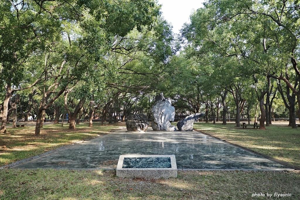 圖書館後方是「思恩園」(校友花園),三顆巨石是校友捐獻的,象徵東海的校訓:求真、篤信、 力行。