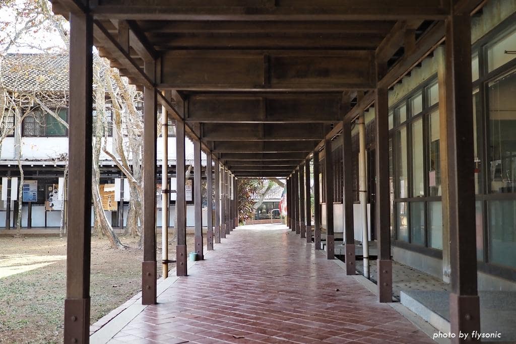 地上的紅磚,木造迴廊與窗欄,好復古的建築。