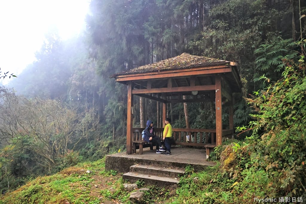走了大約 7、8 分鐘後,抬頭見到一座涼亭,涼亭旁隱隱約約浮現巨石的線條。
