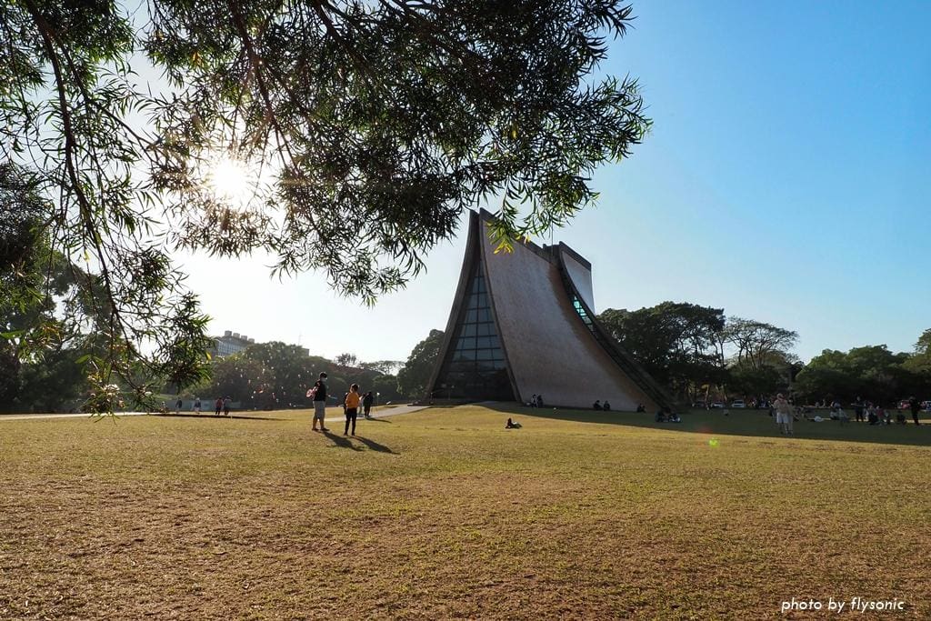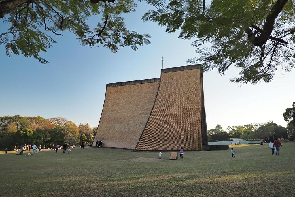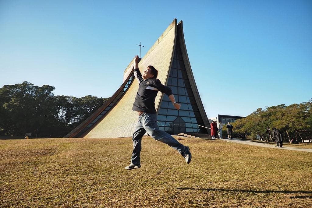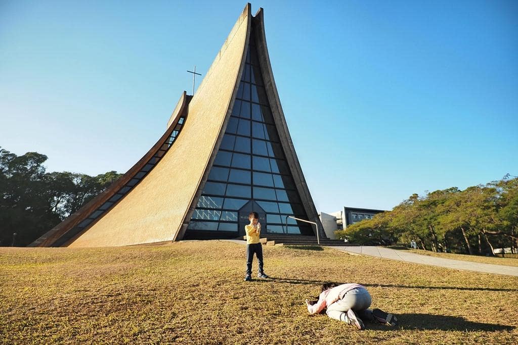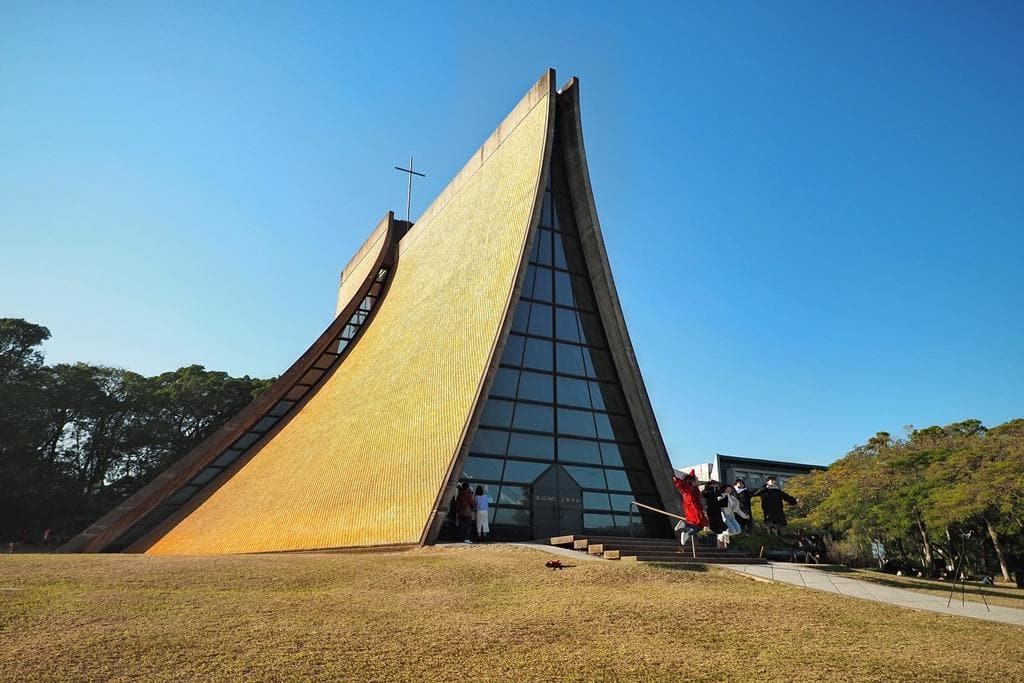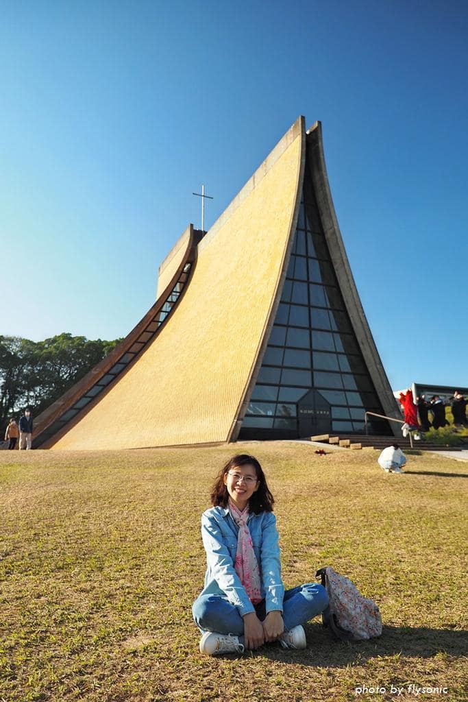 教堂的建築形式非常特別,是用四個曲面所組成,四面各自分離,中間以玻璃邊窗連接,從外觀看,就像一雙虔誠祈禱的手,優美而神聖。