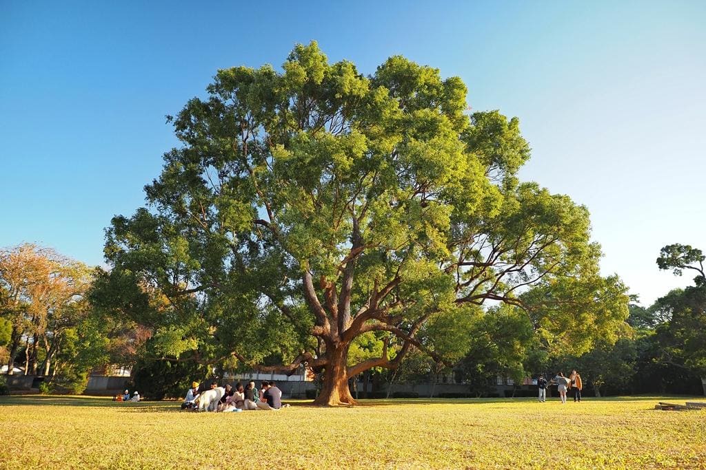 草皮上這棵大樹真美!在大學裡相當少見。