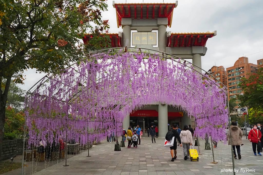 站前廣場有一座高大的牌樓,另外還增加了紫藤裝飾物供遊客拍照。