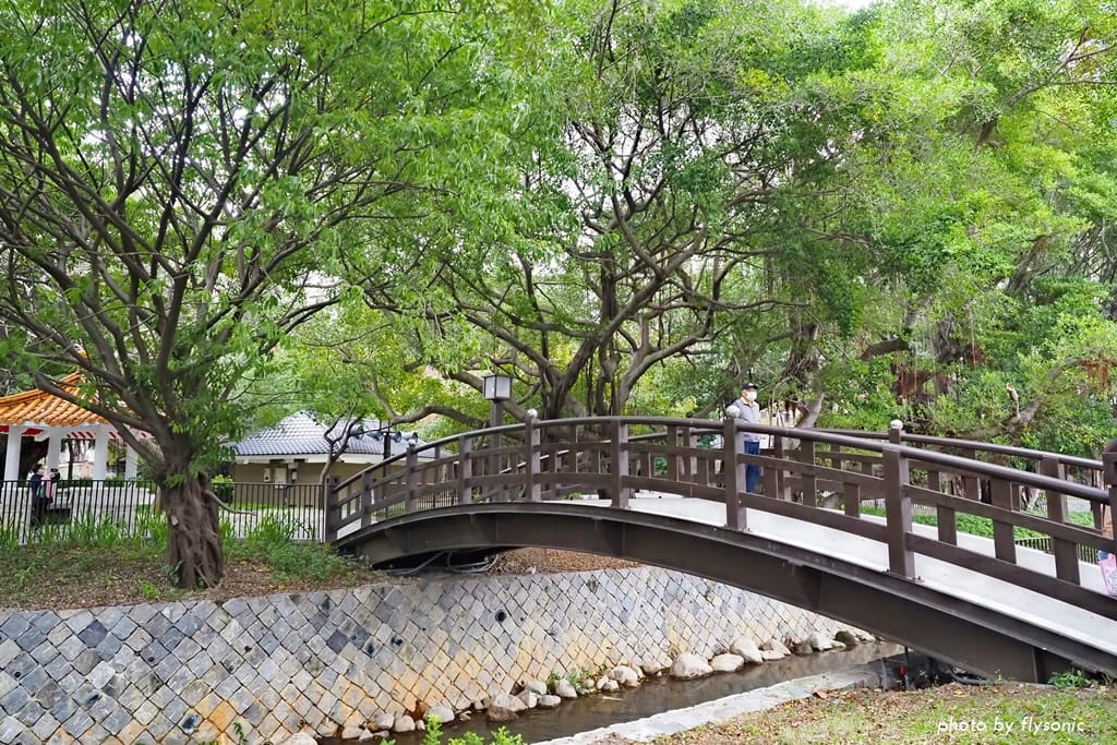 七星公園種植了許多植栽,這些樹木在冬天還非常鮮綠。跨過橋就是兒童遊具區。