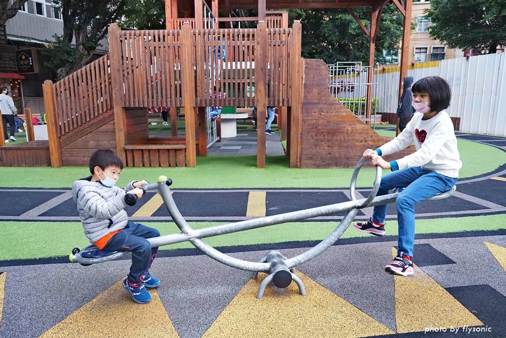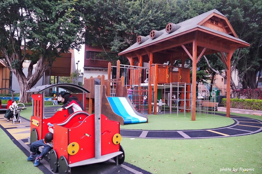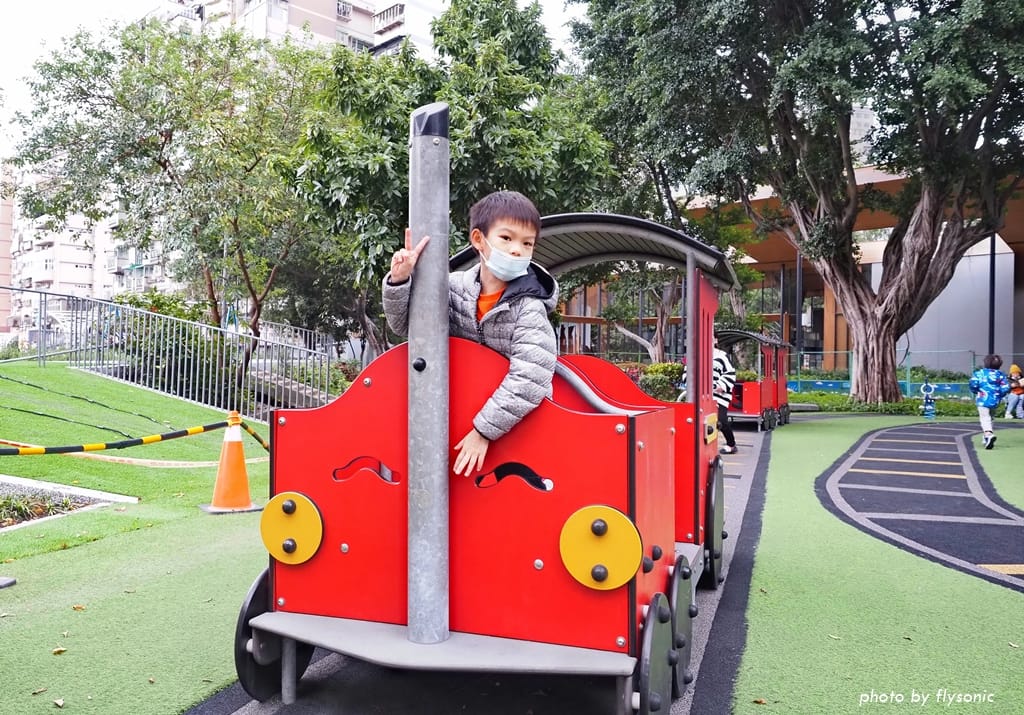 長安公園是北投的特色親子公園,高高的磨石子溜滑梯就是車站造型,一旁還有小火車、翹翹板、繩索搖搖床等遊戲設施。