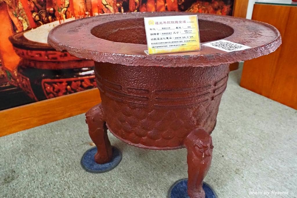 清道光 15 年的鉎鐵金爐(鼎)是萬和宮珍藏文物,館方特別放一張宮廟的媽祖神像照片跟它搭配。