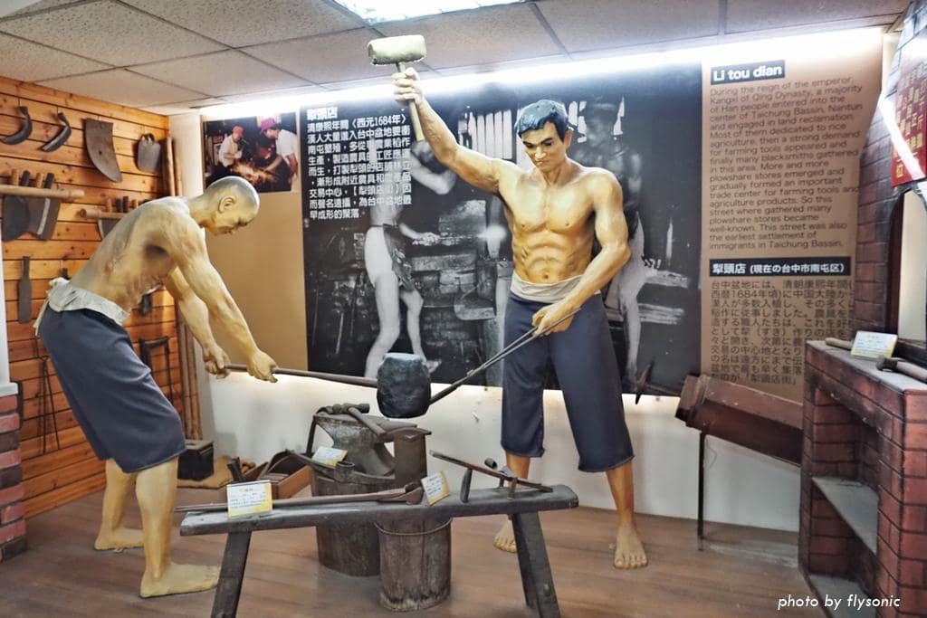 繞一圈回到入口處的展區,這裡模擬南屯犁頭店開闢時期的打鐵業,展出的打鐵用具都是在地的慶隆犁頭店所捐贈。