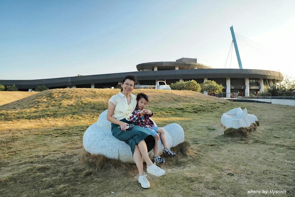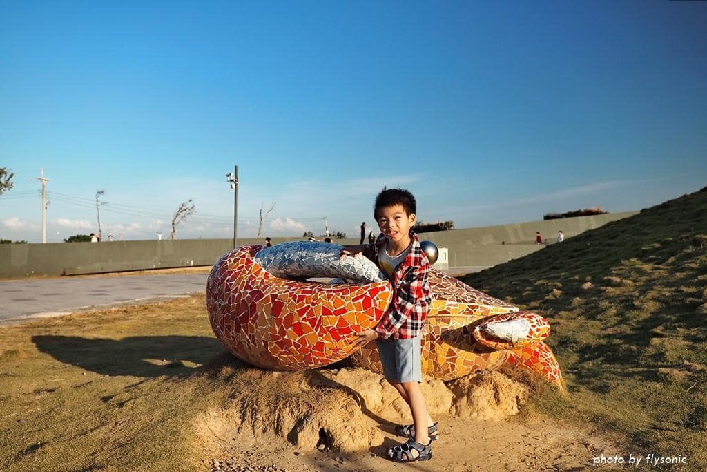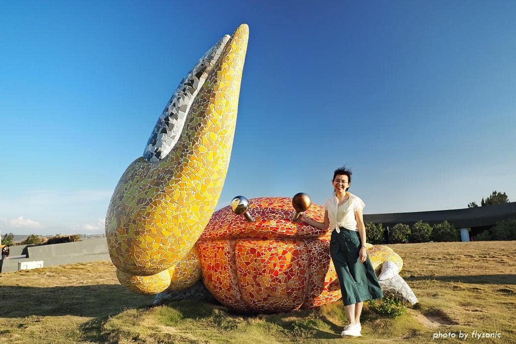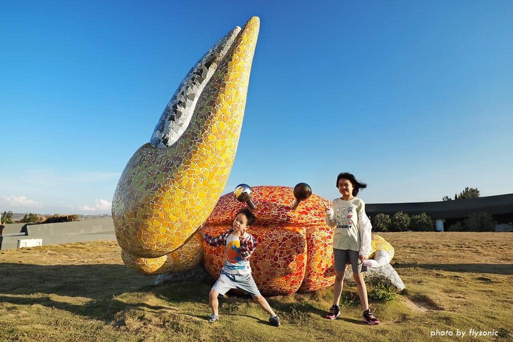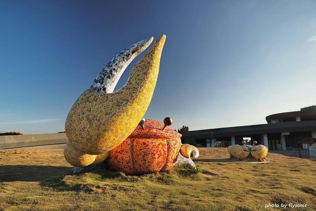 回到遊客中心,戶外廣場有一大片草皮,放置招潮蟹和貝殼造型的裝置藝術。