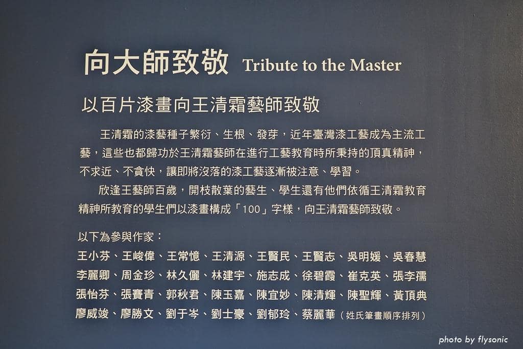 為了慶祝王清霜百歲誕辰,今年(2021)舉辦這個百歲特展,後輩們特別以漆畫排成 100 字樣,向王清霜致敬。