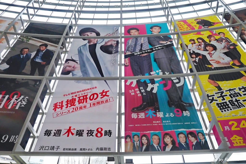 朝日電視台是一棟挑高建築大樓,寬廣的空間,大片的落地玻璃牆,具有穿透性,掛上巨幅海報,也讓人震撼。