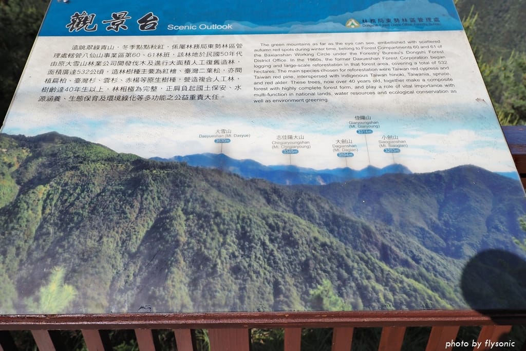 觀景台上的解說牌顯示著遠方這幾座山,都是台灣有名的大山,還可以眺望谷關的聚落。