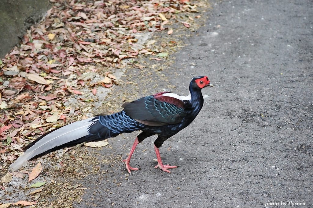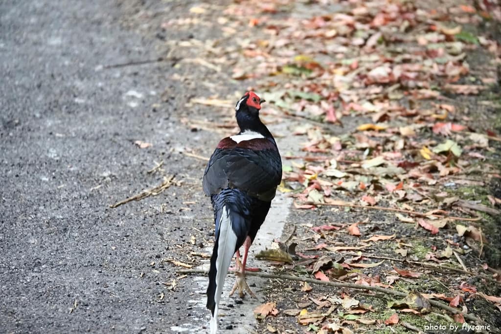 下山途中突然出現一隻稀客,所有的車輛都停下來。原來是一隻藍腹鷳,大剌剌的在馬路上散步,完全不怕往來的車輛。