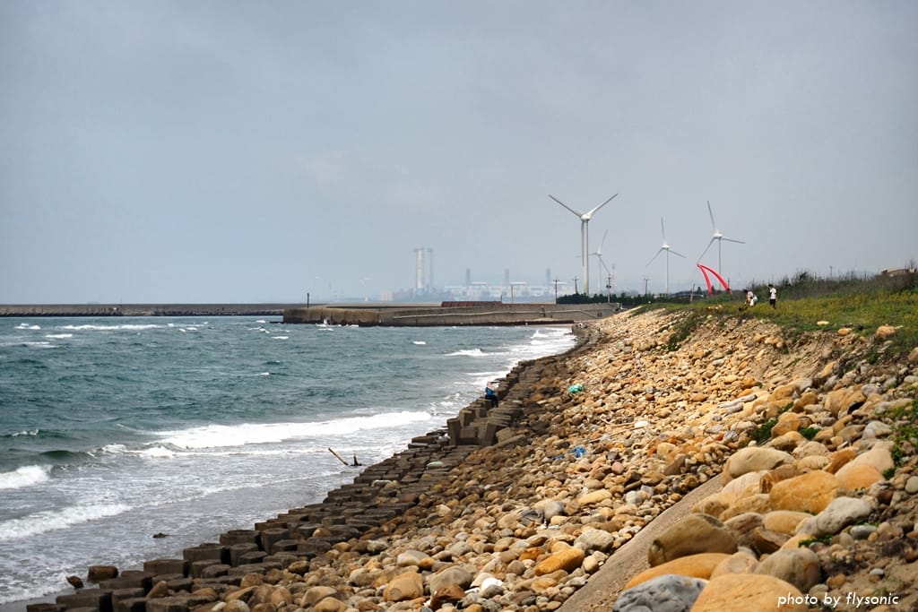 海岸堤防比較高,下面是鵝卵石及消波塊。現在是漲潮,看不到沙灘。