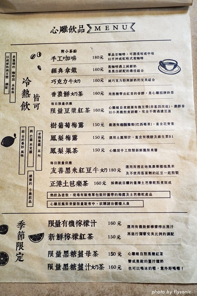 心雕居的正餐以套餐為主,有 500 元的當季料理(六選一)或是 680 元以上的限量套餐(五選一),附餐有飯、湯、甜點、飲料。兒童餐是 350 元。