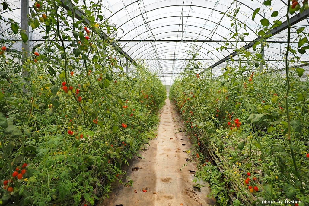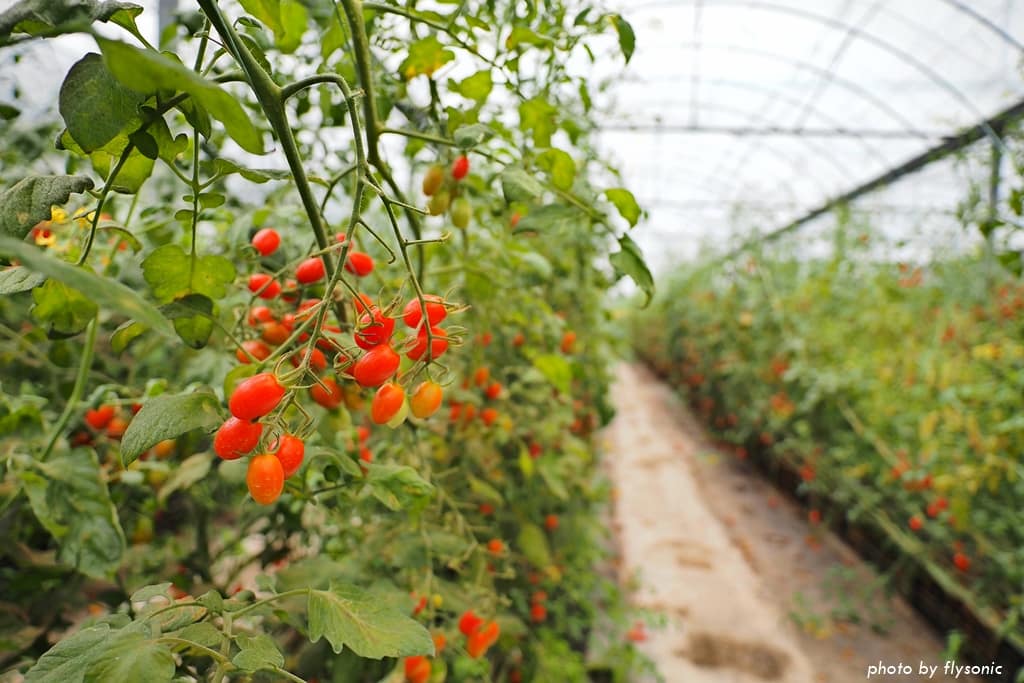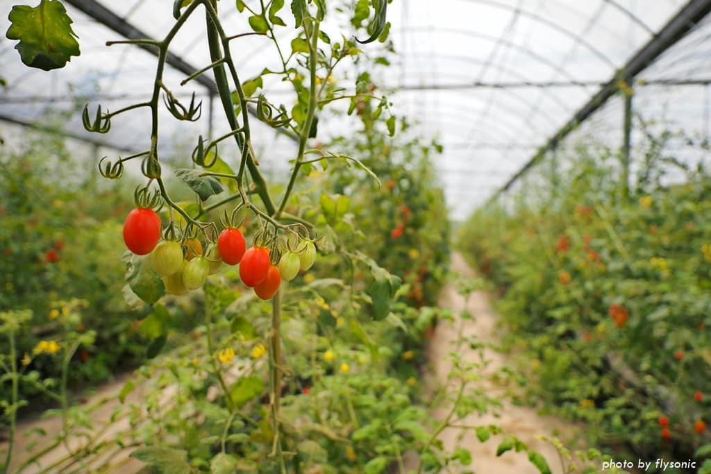 溫室小番茄的位置在果園最後方,目前可以採果,摘多少算多少,一斤 130 元。