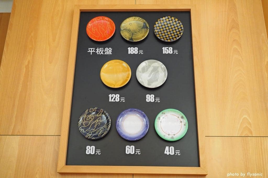 壽司按照盤子計價,分為 40、60、80、98、128、158、188 元共七種價位,在迴轉壽司界算是中高價位。「平板盤」就是從平板電腦點餐的盤子,價格以電腦上顯示為準。店內另外有收 5 %服務費。