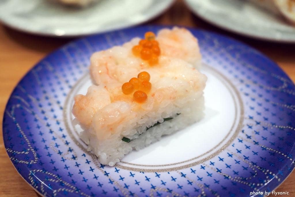 押壽司形狀很特別,在迴轉壽司店比較少見,新鮮的蝦子配上鮭魚卵,醋飯裡面夾著紫蘇葉,去腥提香解毒,味道很配。