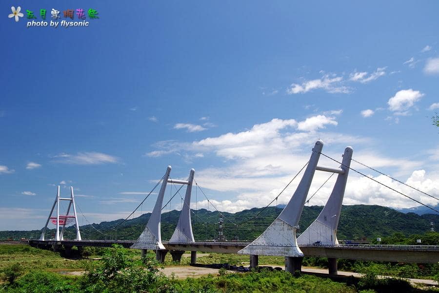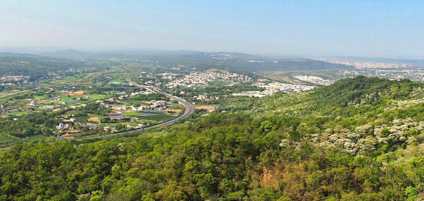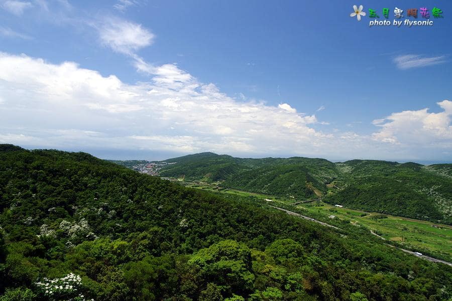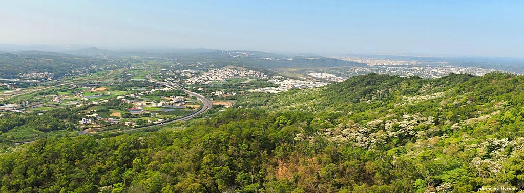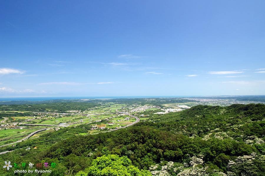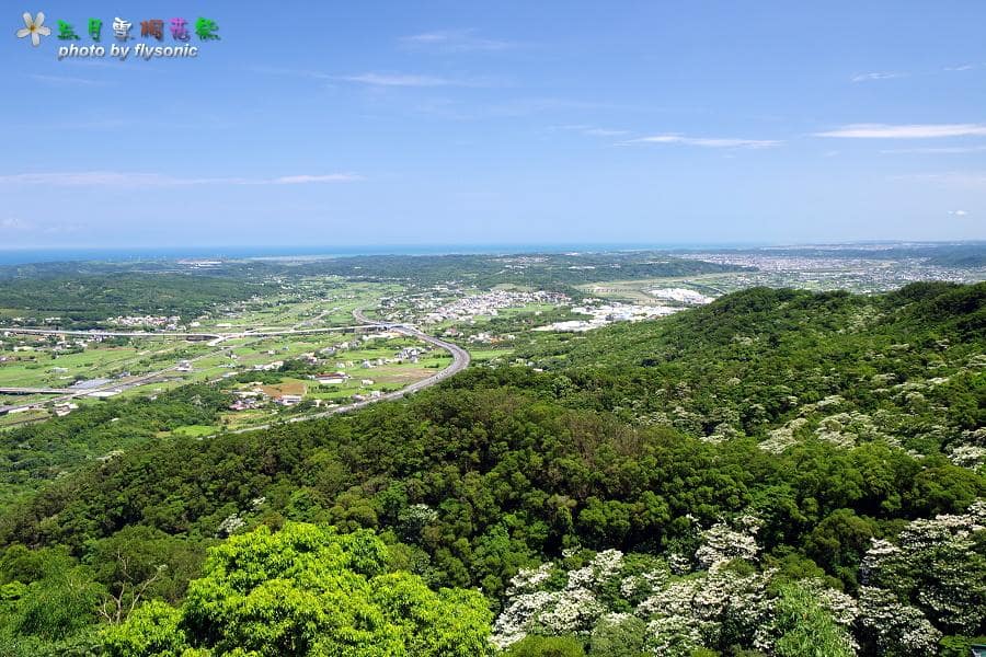 一覽無遺,非常遼闊,國道一號高速公路蜿蜒其中,山上的有許多桐花盛開著。
