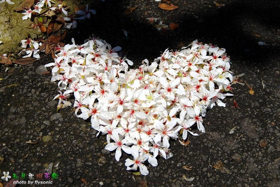 ▲剛好在馬路上發現已經排好的心形桐花,不知道是哪位喜愛桐花的遊客,特地花時間蒐集桐花,排成愛心狀。