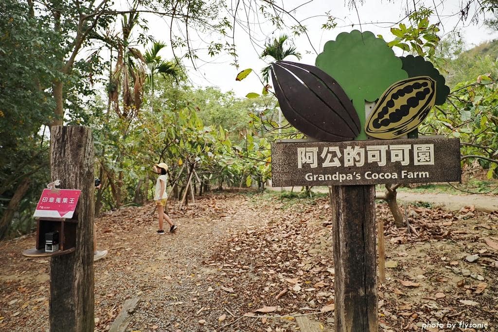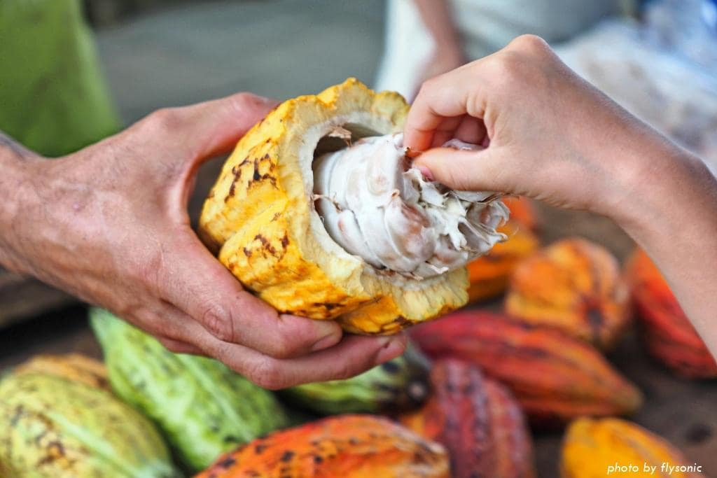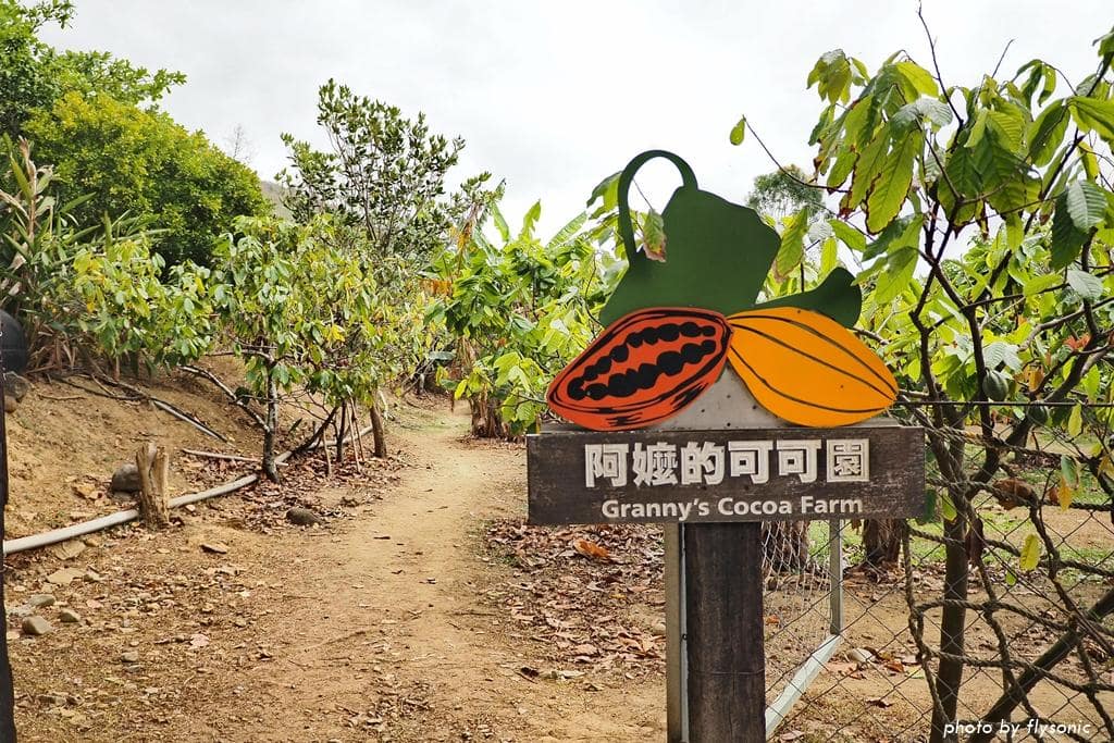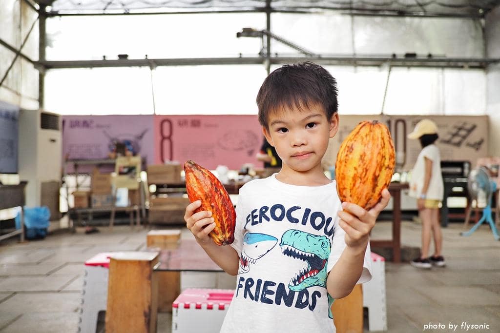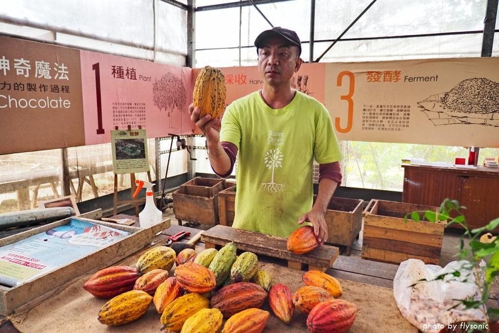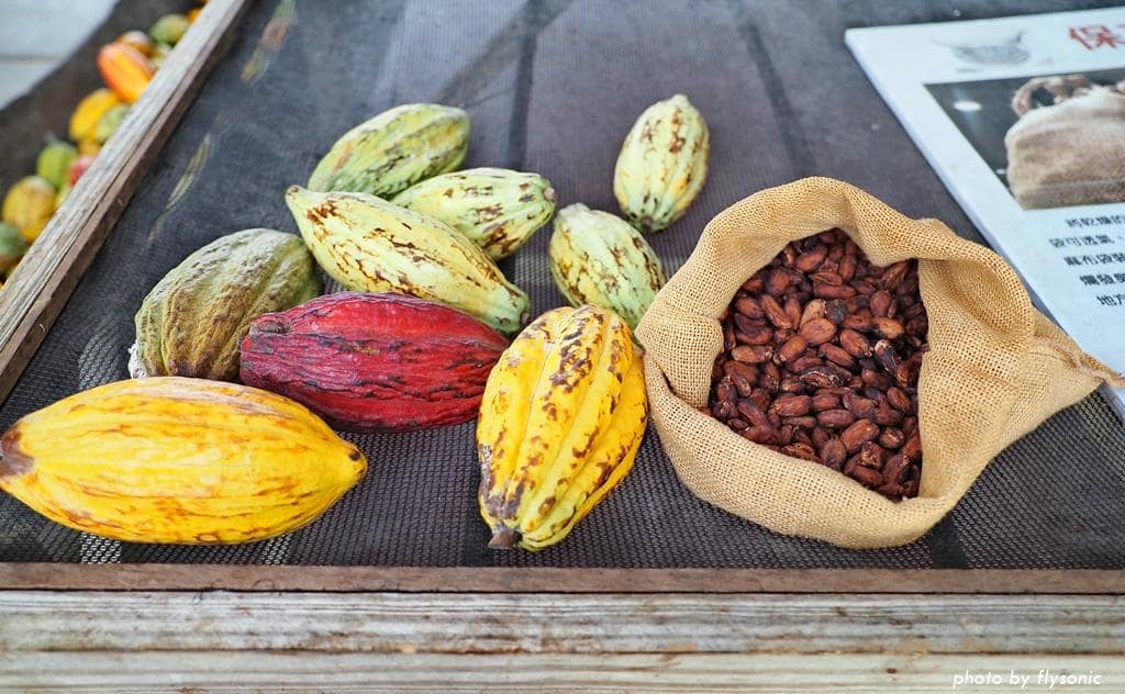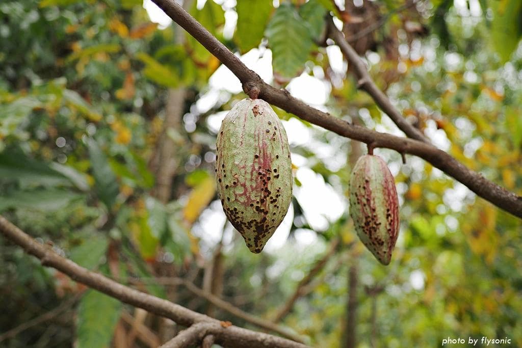 園區有一個阿公可可園、一個阿嬤可可園。這些可可樹都是用有機農法栽培,農場的巧克力都是用自家採收的可可果製作的。