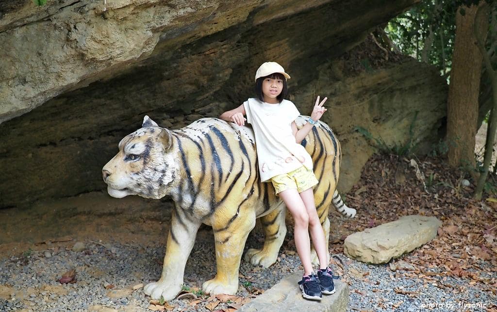 兒子跟姐姐搶著爬上老虎的背,結果他爬不上去,改來跟牛照相。