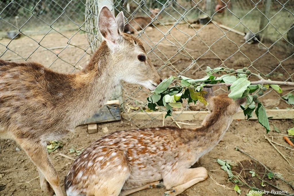梅花鹿跟兔子一起養在這個圍欄裡面,拿著購買的胡蘿蔔跟葉子就可以進去餵食。