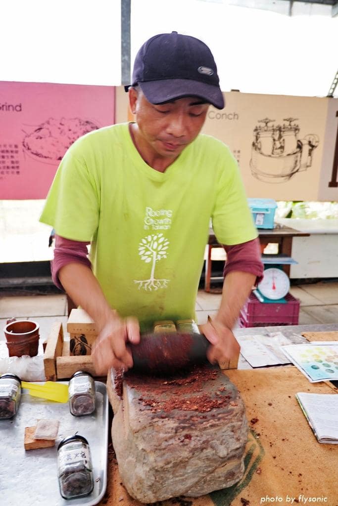 他把可可豆壓碎磨成粉,分給大家嚐嚐看。
