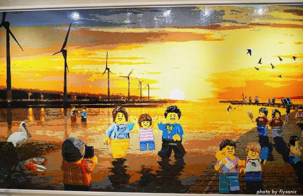 這是樂高認證大師黃彥智耗時三個月,用了超過 20 萬顆積木所打造出來的台中景點,也是全台最複雜的樂高牆。遠看就像是一幅印象派的畫作,實際觸摸,會發現真的是用小顆粒樂高一顆一顆拼出來的,金色夕陽倒映在溼地上的漸層光澤感,用樂高表現得淋漓盡致,實在厲害!
