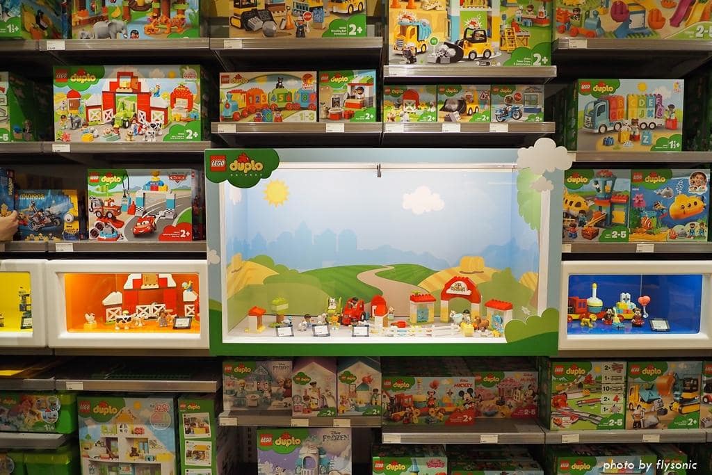 店裡擺滿了樂高盒,這一整面牆壁的 Duplo,有很多是我從沒看過的。