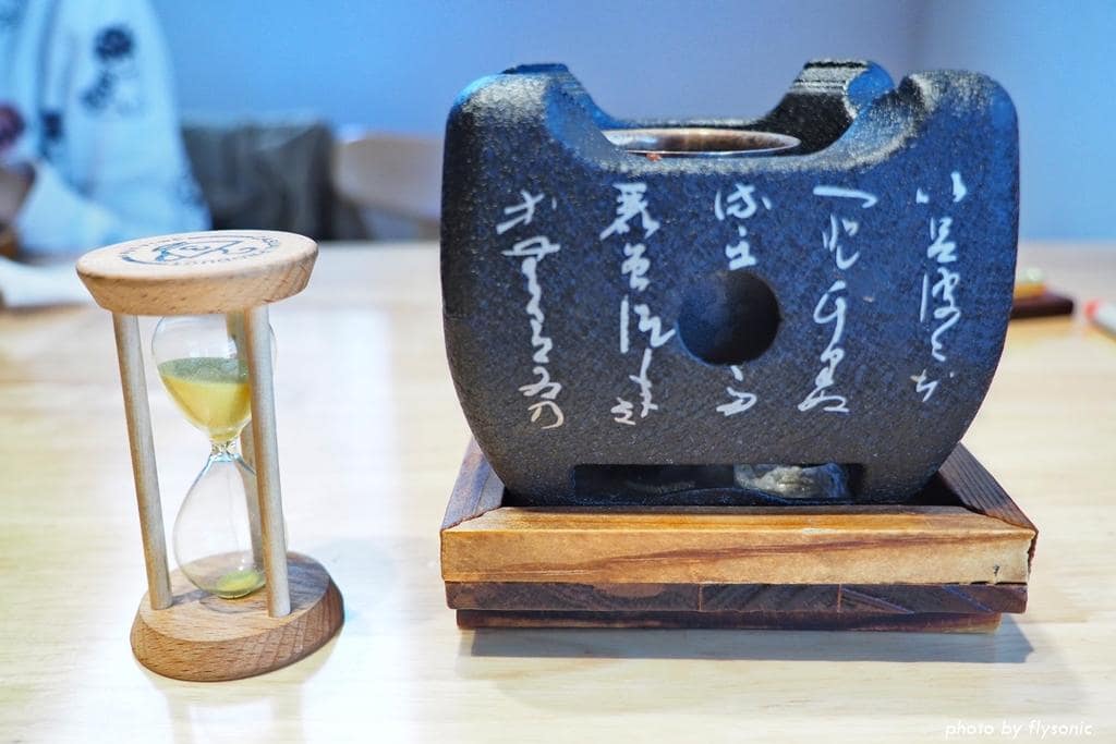 每張桌面都擺上專用的烤盤及沙漏。一旁也有七味粉及和風沙拉醬。